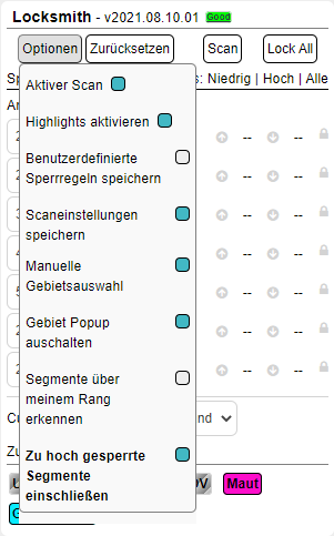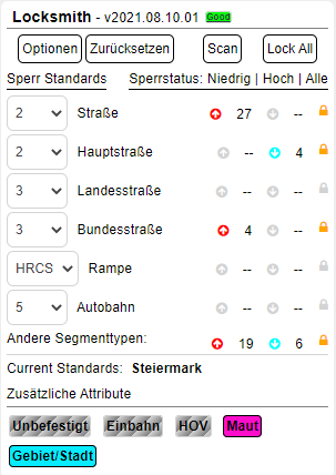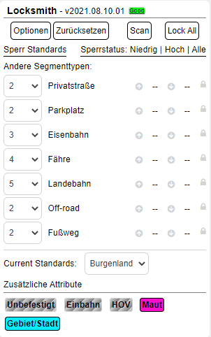 - Scaneinstellungen speichern bewirkt, dass die folgenden Einstellungen zwischen den Aktualisierungen bestehen bleiben: Aktiver Scan, Highlights aktivieren, Segmente über meinem Rang erkennen und Übersperrte Segmente einschließen. Locksmith ist so eingerichtet, dass sowohl der lokale Speicher als auch, wenn der Redakteur dies wünscht, die browserübergreifende Speicherung von WazeWraps-Einstellungen verwendet
