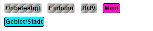 Unten gibt es mehrere zusätzliche Attribute, die basierend auf den Einträgen in der Tabelle farbig (aktiviert) sind. Dazu gehören, wenn Segmente einen unidirektionalen, unbefestigten, HOV- oder Mautstandard haben, der sich vom regulären Landesstandard unterscheidet, sowie wenn ein Bundesstaat einen Polygon- (WKT) oder einen auf Städtenamen basierenden Standard hat. Diese Einstellungen (sofern verfügbar) können durch Anklicken aktiviert/deaktiviert werden.
